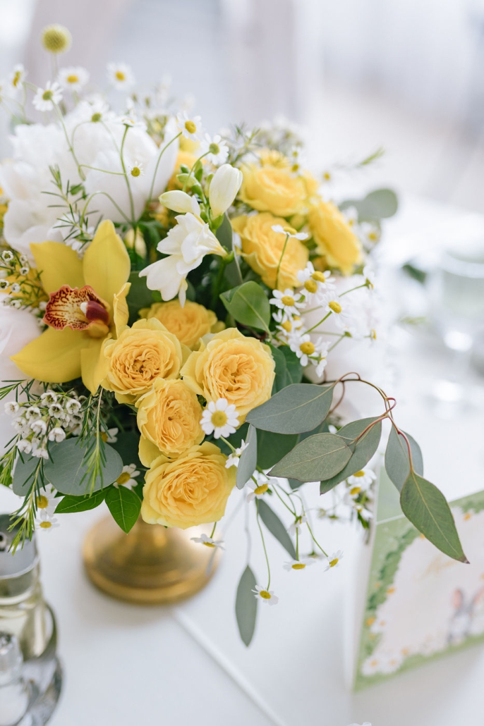 Pentru decorul unei mese rotunde, vă recomandăm acest aranjament floral de masă Happy Sunshine, creat cu delicatețe într-o superbă cupă aurie. Acest design floral abundă în tonuri calde, de alb, galben și verde crud, rezultând o combinație cromatică foarte veselă și optimistă.