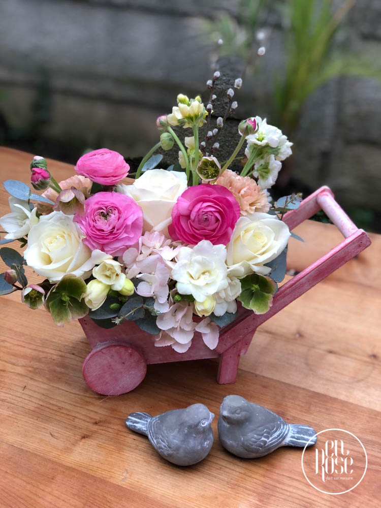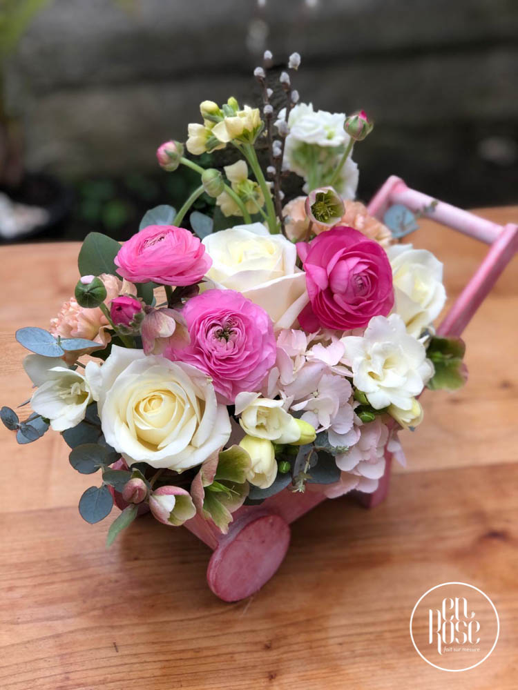 Aranjamentul este realizat într-o mini-roabă de lemn vopsită roz. Parfumul încântător al grădinii în miniatură este asigurat de freziile albe și de florile de matthiola.