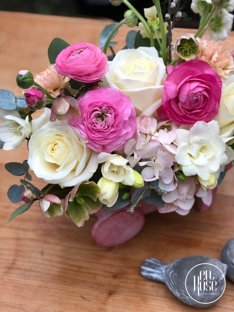 Compoziția florală cuprinde: hortensie roz, ranunculus roz și fuchsia, trandafiri albi, matthiola alba, crenguțe de salix, frezii parfumate, helleborus verde și eucalipt.