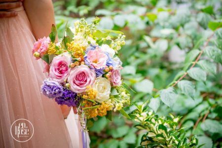 Bulgarasi de Lisianthus violet, trandafirasi roz, Asclepias portocaliu, hortensie albastra, Matthiola galbuie si foarte parfumata, Hippericum, completeaza gama florala.