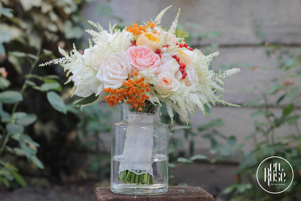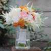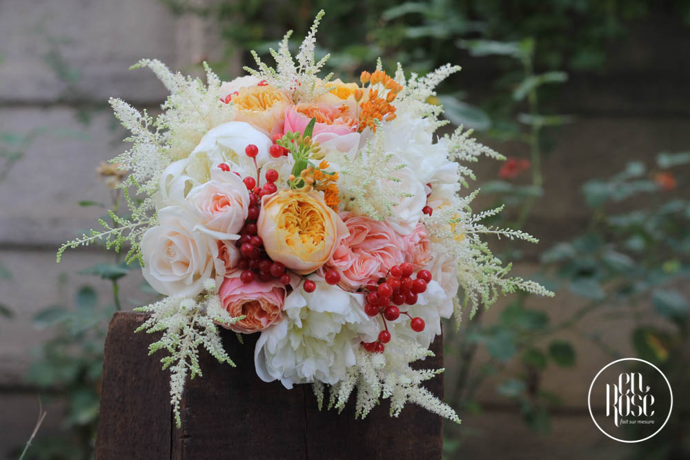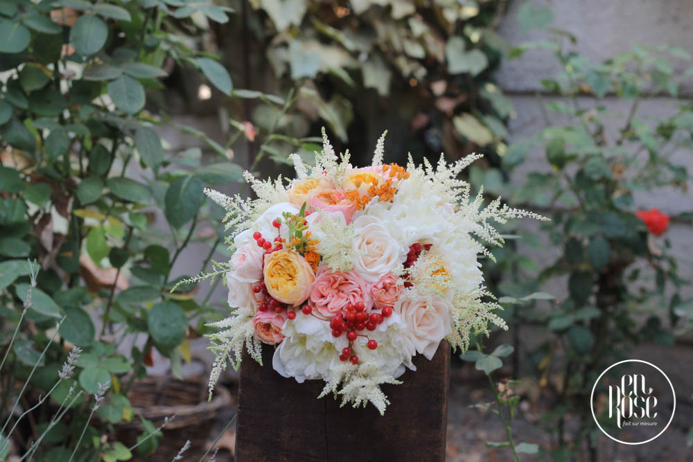 Din compoziția florală prețioasă fac parte și bujori albi parfumați. Aceștia conferă un aspect bogat și învăluie cu parfumul lor inconfundabil. Combinația olfactivă dintre parfumul de bujori și cel de trandafiri de grădină este minunată. Pe lângă acestea, din gama florală mai fac parte: trandafiri Vendela, trandafiri Vuvuzela, minirose roz de grădină, viburnum roșu, asclepias portocaliu și astilbe pufos.