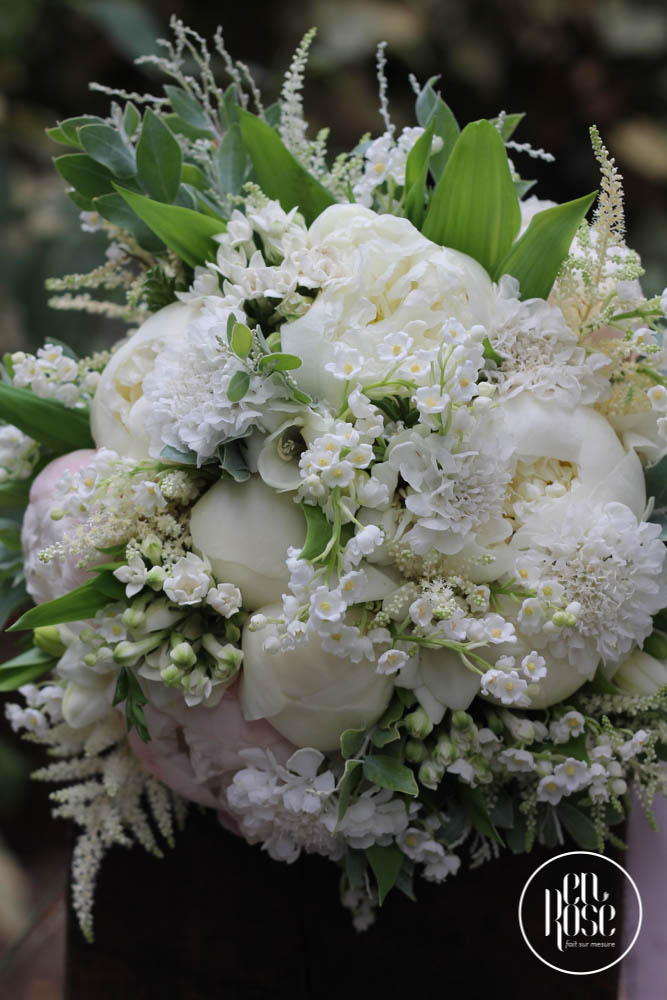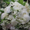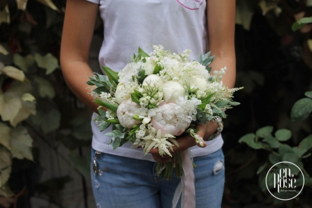 Compoziția florală cuprinde: Lăcrămioare, bujori parfumati, Scabiosa albă, Astilbe, Bouvardia și Acacia.