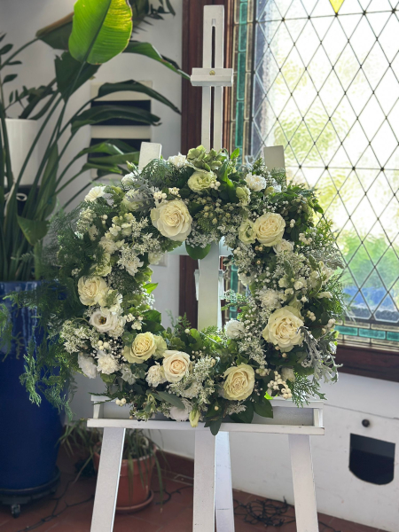 Potrivită unui eveniment de comemorare sau pentru o înmormântare, această coroană funerară cu flori naturale albe și verdeață este un omagiu plin de considerație.