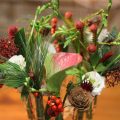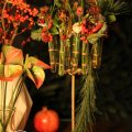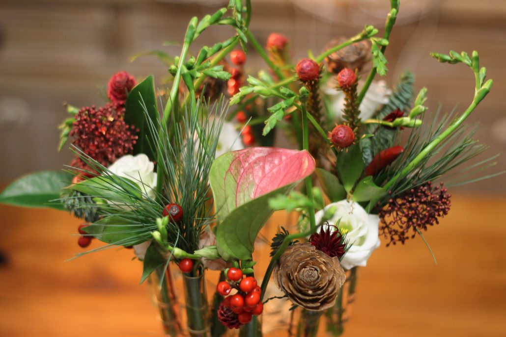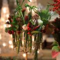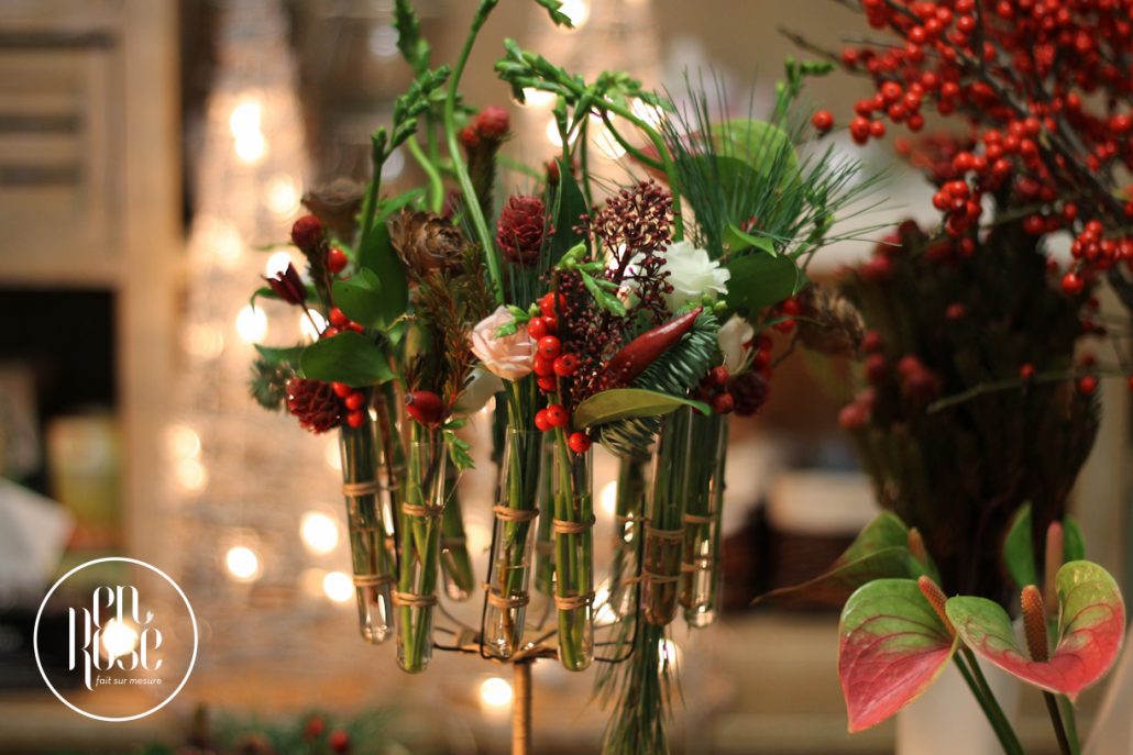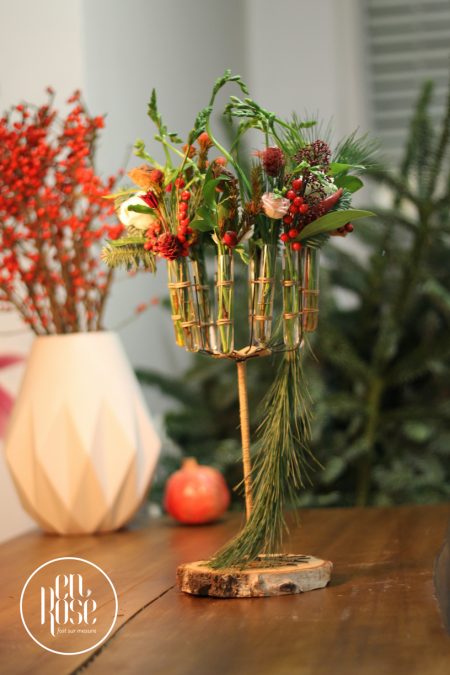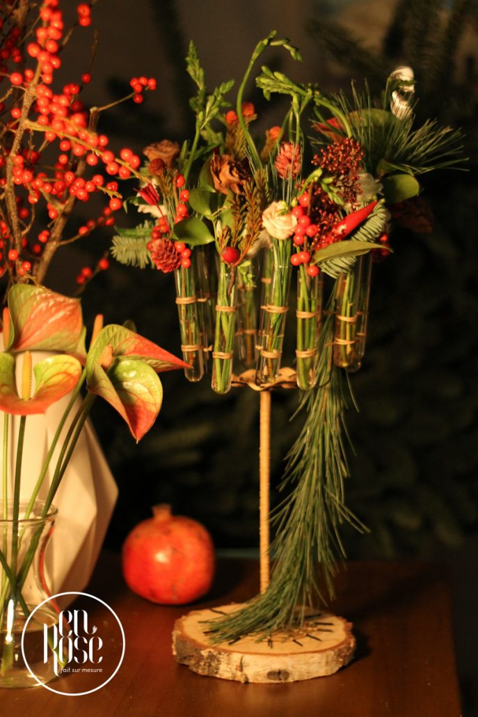 Reteta pentru o piesa de design floral structural de Craciun ne-a venit odata cu faurirea primelor aranjamente de Craciun. Structura este pe un suport de lemn de mesteacan cu diametrul de 15 cm iar intreg ansamblul are 40 cm inaltime. Am adaugat flori pentru fiecare eprubeta in parte: minirose si lisianthus. Ca sa condimentam un pic am ales ardei iute, scortisoara, fructe uscate, macese, ilex, skimmia, pin si frunze de tuia.