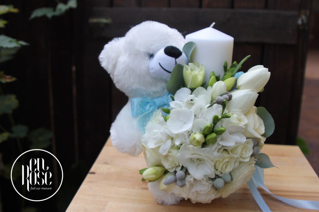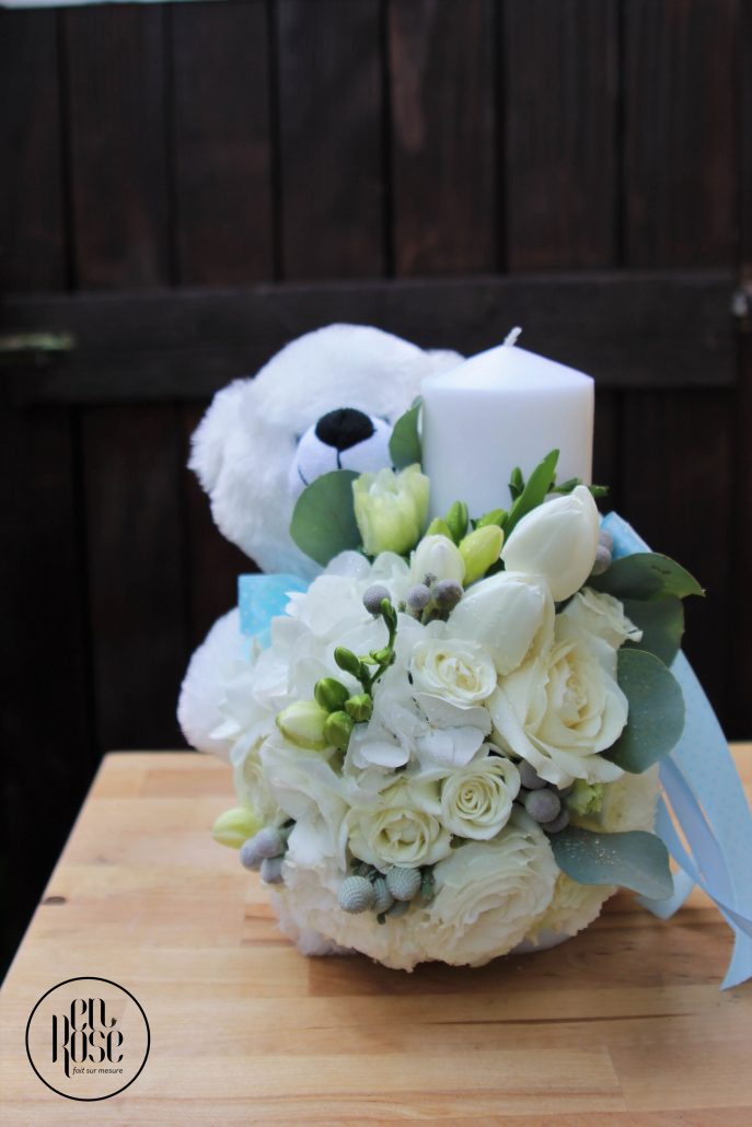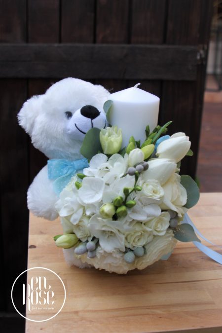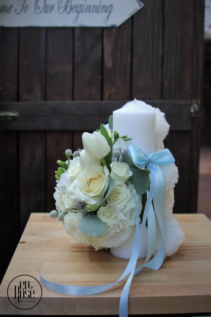 Această lumânare de botez poate fi realizată optând pentru florile preferate. Vă rugăm adresați-vă floriștilor noștri la telefon 0799.950.999 sau pe email la office@enrose.ro, pentru a cere personalizarea aranjamentului. Se poate realiza în diverse culori, acest lucru implicând și schimbarea florilor din compoziție.