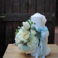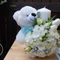 Compoziția florală este alcătuită din trandafiri albi, frezii albe parfumate, minirose, lisianthus, anemone, lalele și bobițe gri de Brunia.