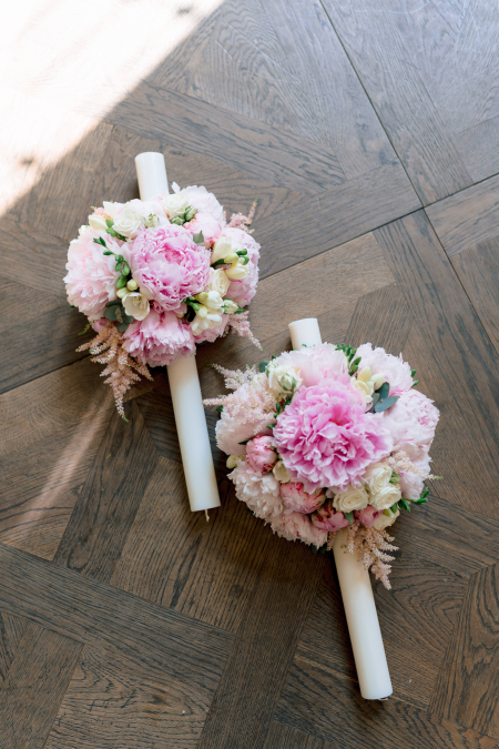 Cromatica este una simplă și delicată. Floriștii enRose au ales tonuri de alb și roz pastelat. Texturile catifelate și diferitele forme de petale, dau naștere armoniei florale . Eleganța și frumusețea bujorilor se remarcă în aceste creații florale.