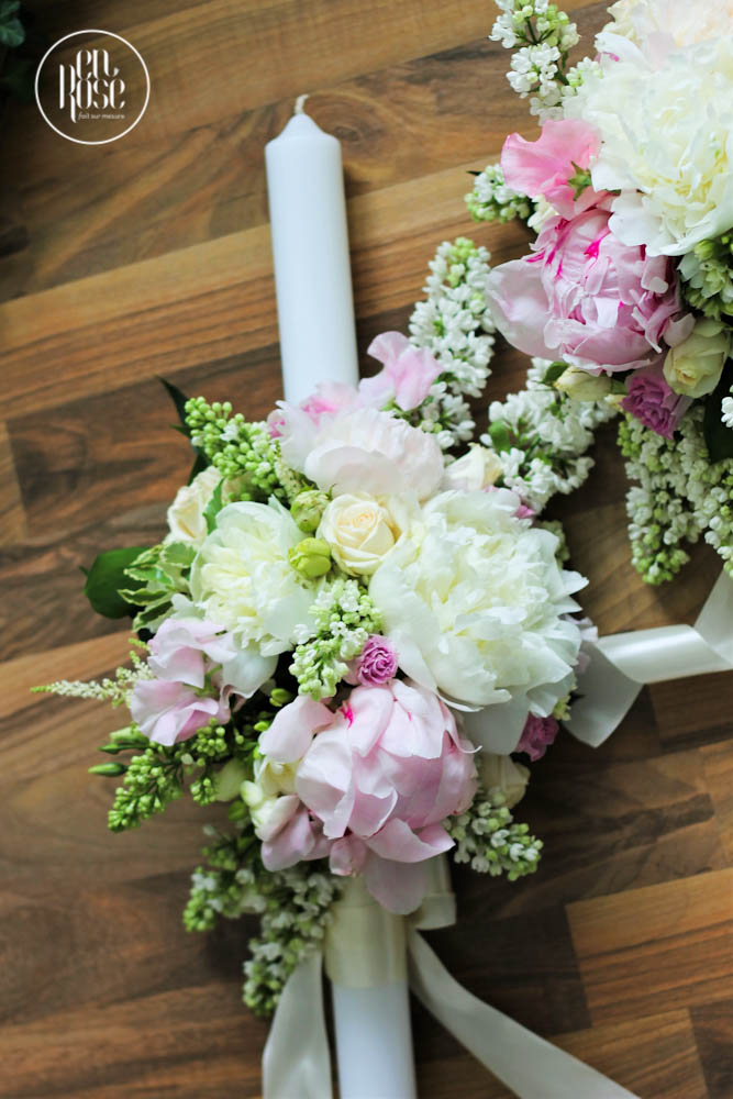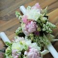 Combinatia dintre bujori si liliac este una perfecta, texturile lor se imbina minunat in aranjamentul floral lucrat pe o parte.
