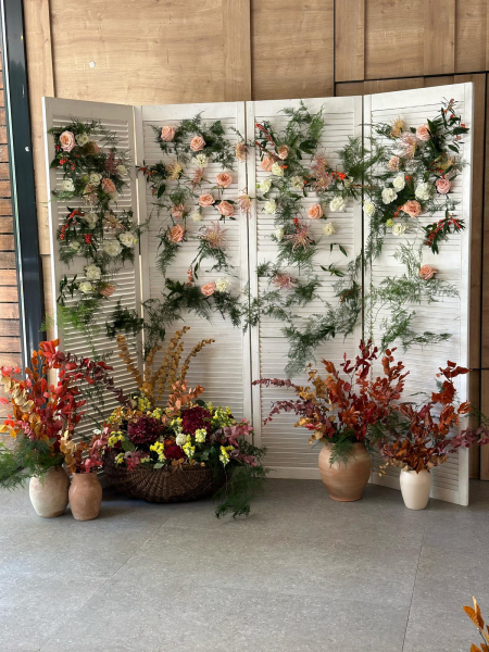 Pentru evenimente de poveste floriștii enRose recomandă acest Photocorner/ panou floral „Colț de toamnă”.