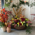 Baza este îmbogățită cu aranjamente florale de toamnă în vase ceramice și coșuri împletite, cu frunziș în tonuri calde — arămiu, burgundy și auriu — care adaugă profunzime și volum întregii compoziții.