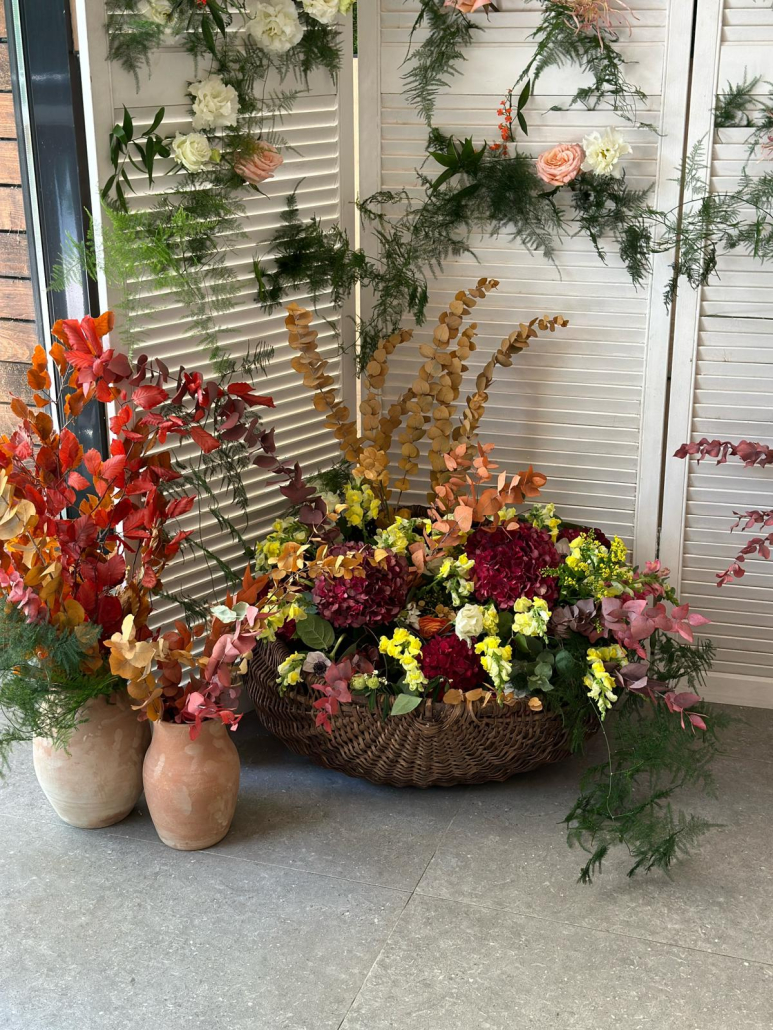 Baza este îmbogățită cu aranjamente florale de toamnă în vase ceramice și coșuri împletite, cu frunziș în tonuri calde — arămiu, burgundy și auriu — care adaugă profunzime și volum întregii compoziții.