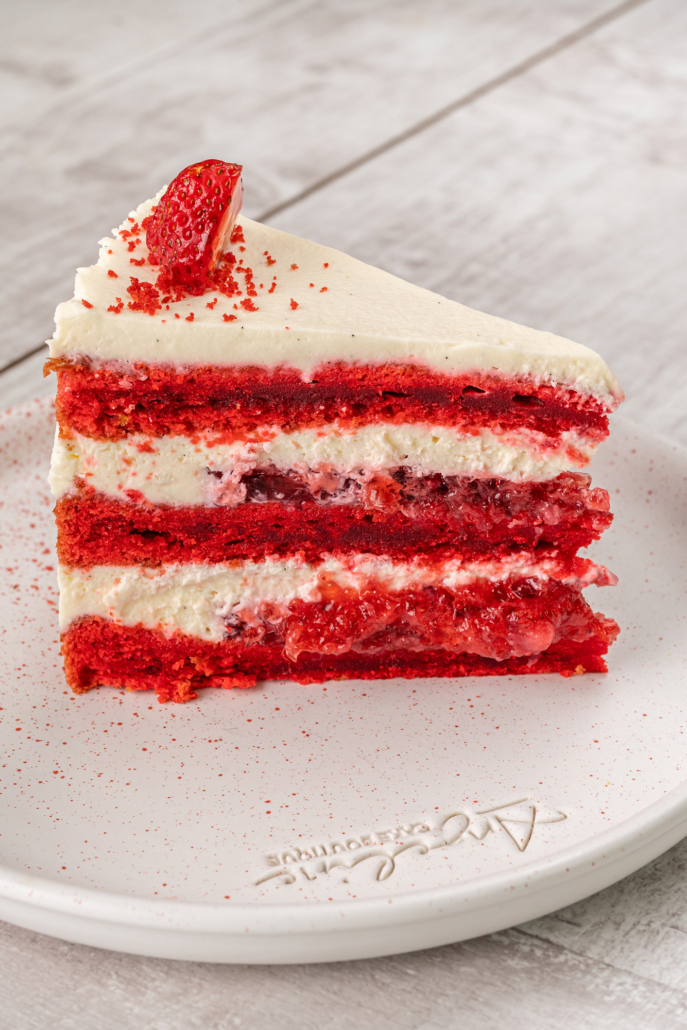 Compoziția include: blat red velvet, cremă de mascarpone cu aromă de trandafir și inserție de căpșuni.
